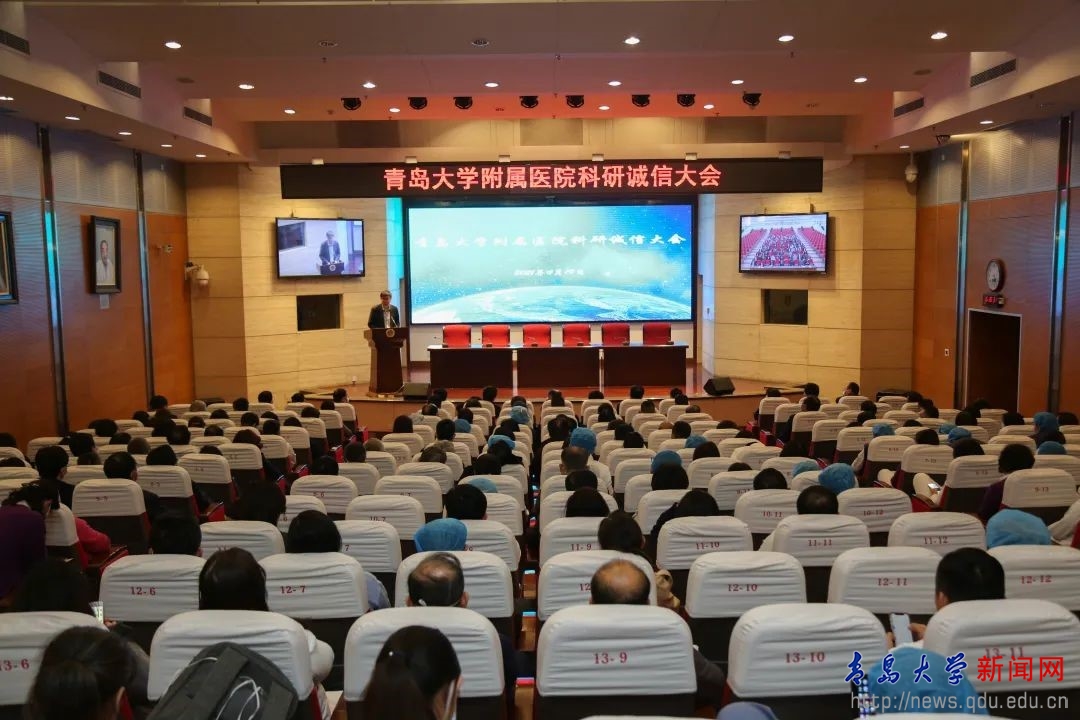 誠信大會上,青島大學第一臨床醫學院院長牛海濤作《構建風清氣正學術氛圍 共創高質量發展新格局》工作報告。他分析了國內外醫學界以及醫院的科研誠信整體形勢,通報了醫院對“問題學術學位論文”的調查處理情況。他要求嚴格履行誠信建設第一主體責任,以健全的科研誠信內部管理體系落實關鍵環節監管,以常態化教育引導全院人員自覺規范研究行為,通過多措并舉、綜合施策,營造風清氣正的科研生態。