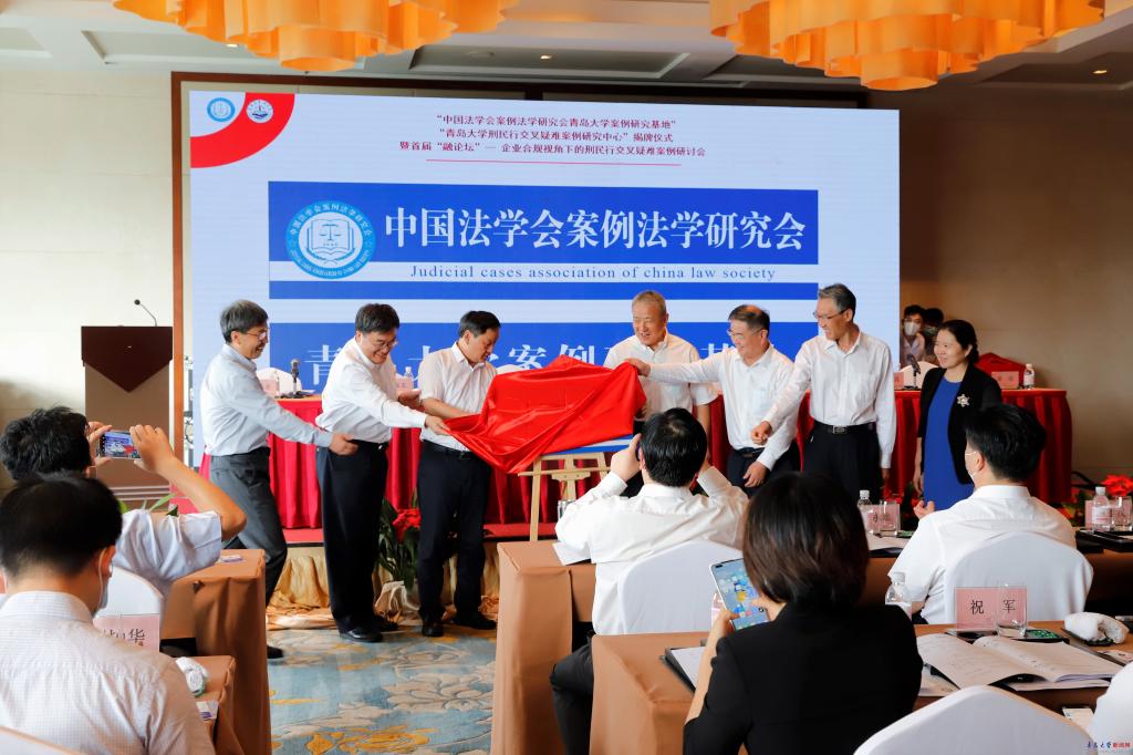 梁欣宣讀青島基地成立決定。胡云騰、夏東偉、梁欣、李方民、孫友昌、萬振東、牛傳勇共同為中國法學會案例法學研究會青島大學案例研究基地和青島大學刑民行交叉疑難案例研究中心揭牌。