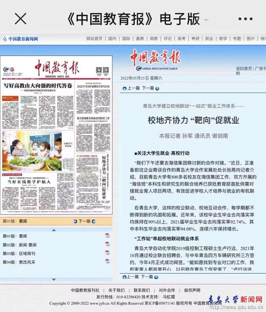 新聞網訊 5月21日,《中國教育報》以“校地齊協力‘靶向’促就業”為題,在頭版倒頭條刊發長篇通訊,推廣我校打造校地聯動“一站式”就業工作體系工作經驗: