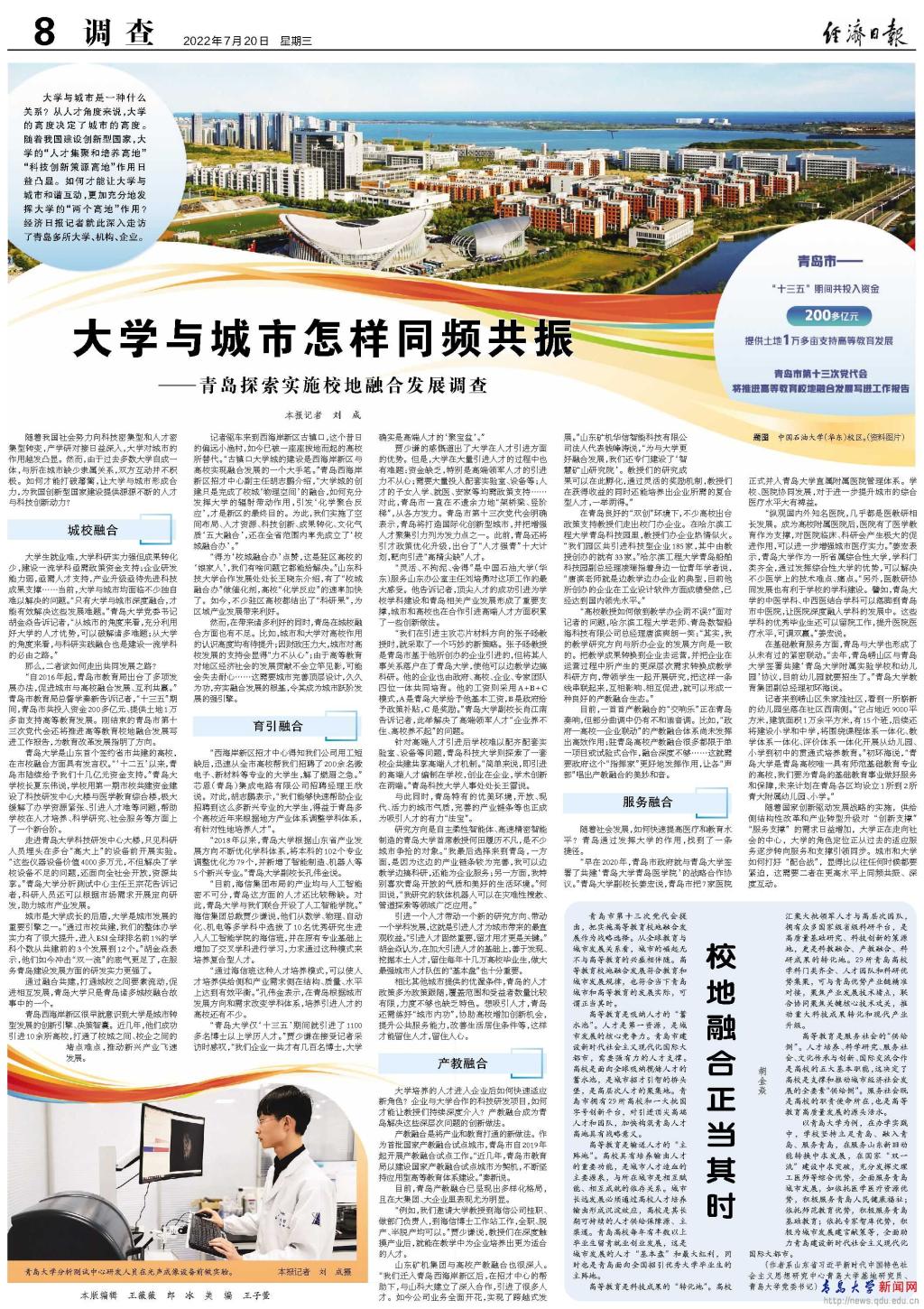 新聞網(wǎng)訊 7月20日,《經(jīng)濟(jì)日?qǐng)?bào)》記者劉成發(fā)表“大學(xué)與城市怎樣同頻共振——青島探索實(shí)施校地融合發(fā)展調(diào)查”,以青島大學(xué)為例從城校融合、育引融合、產(chǎn)教融合、服務(wù)融合四個(gè)方面深入分析了大學(xué)與城市的關(guān)系。