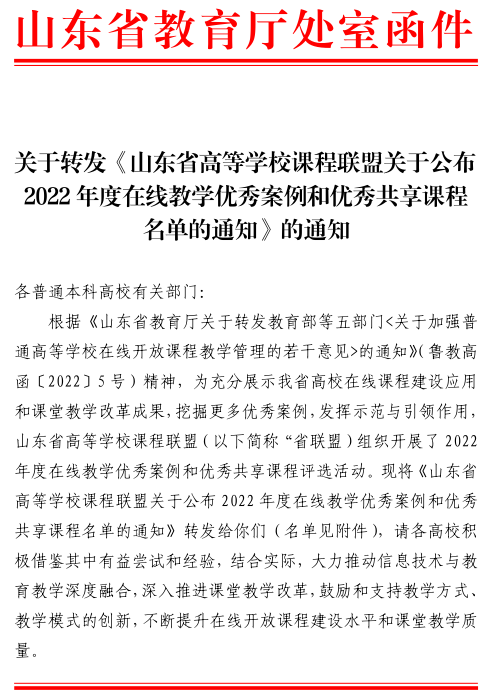 新聞網訊 近日,山東省教育廳下發了《山東省高等學校課程聯盟關于公布2022 年度在線教學優秀案例和優秀共享課程名單的通知》。我校共獲批9項,其中優秀共享課程4門,在線教學優秀課程教學類案例4項,優秀管理類案例1項。