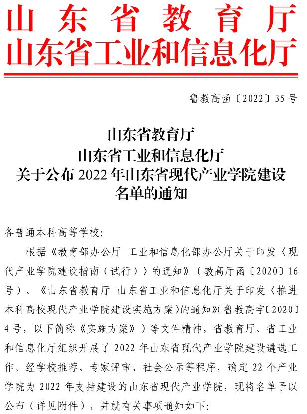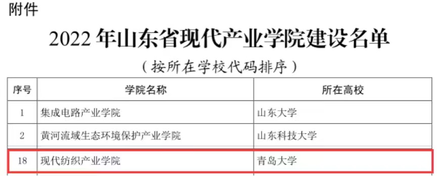 新聞網訊 近日,山東省教育廳、山東省工業和信息化廳公布了2022年山東省現代產業學院建設名單,學校申報的“現代紡織產業學院”獲批立項,這是我校繼海信人工智能學院之后,獲批的第二個省級現代產業學院。