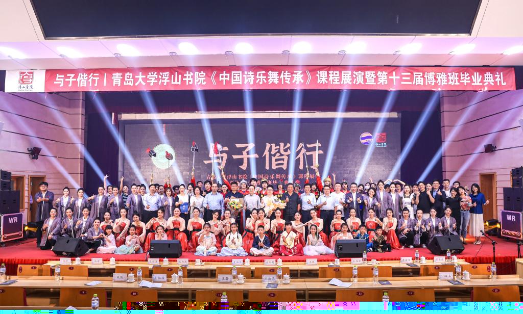 新聞網訊 6月3日晚,浮山書院“與子偕行”——“中國詩樂舞傳承”課程展演暨第十三屆博雅班畢業典禮在國際學術交流中心博學廳舉行。青島市委宣傳部常務副部長姜劍超,青島市人大常委王為達、王岐,新華社青島支社社長徐冰,山東省廣播電視臺駐青島記者站主任叢芳受邀出席。學校原黨委書記夏臨華,校黨委常委、副校長孔偉金,青島市文聯主席、美術學院院長王紹波及相關職能部門、學院領導與來自全校各學院400余名學生代表一起觀看了展演和典禮。