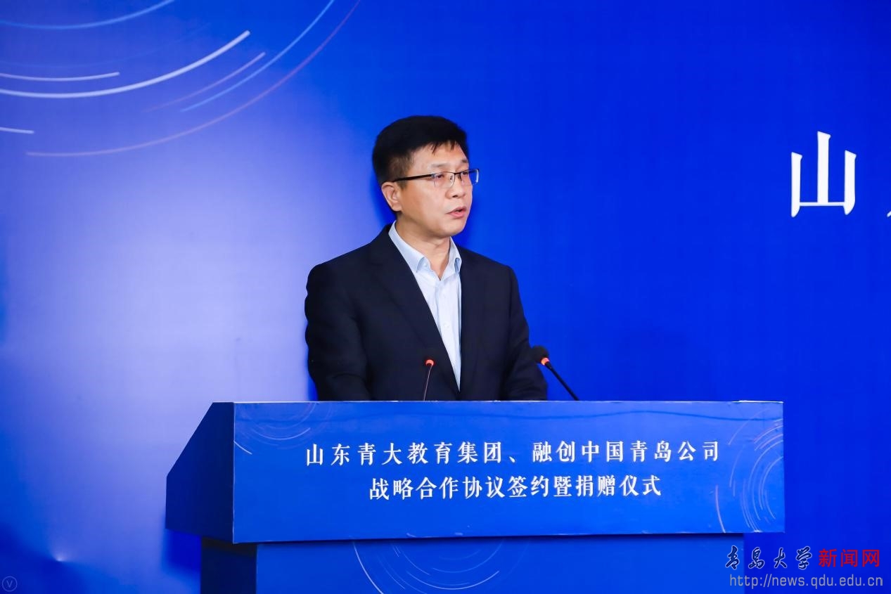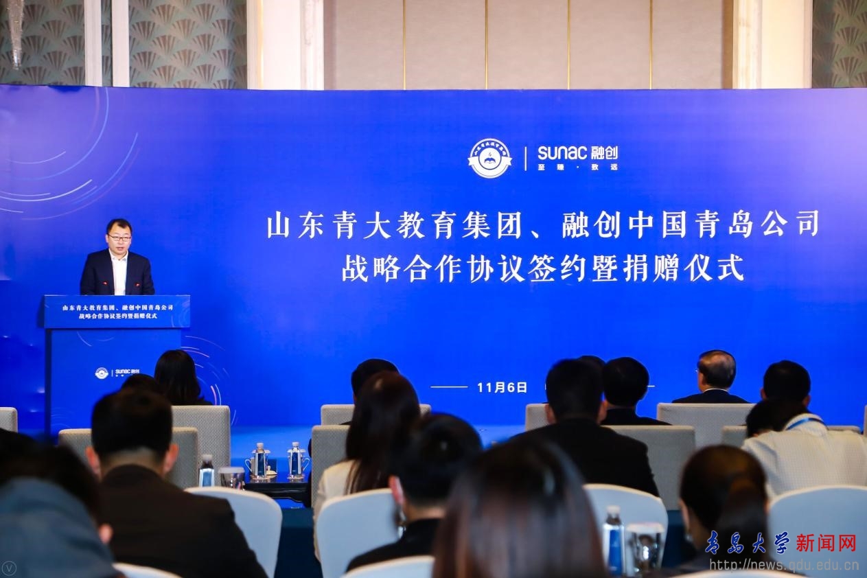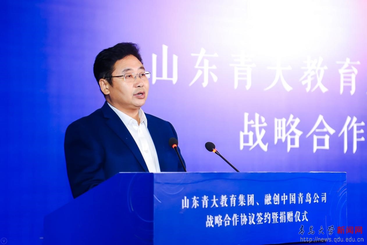 儀式上,于紅波代表學校致辭。他表示,融創中國自2016年布局青島,對青島的城市建設和人文特色有著深刻的理解。此次雙方戰略合作協議的簽署,標志著實質性合作邁出堅實的步伐。將進一步促進青島大學學科、人才優勢與融創中國青島公司的產業、資源優勢的有機結合。最后他對融創中國青島公司的慷慨捐贈表示了衷心的感謝,希望雙方精誠合作,統籌推進在西海岸和膠州市基礎教育的布局,充分發揮名校的輻射帶動作用,助力西海岸和膠州優質教育均衡發展。