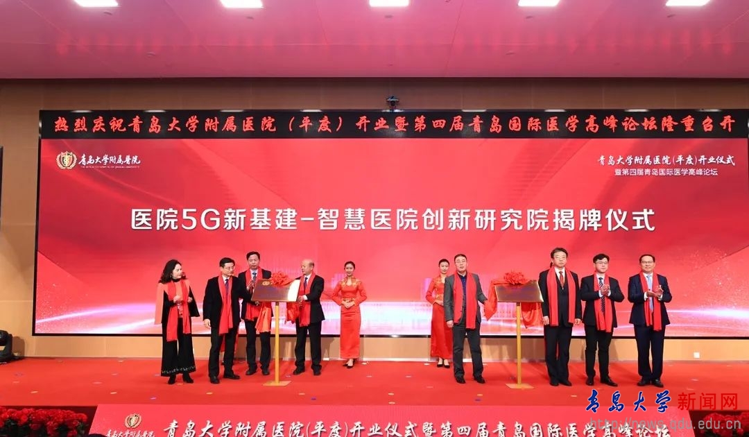 青島大學(xué)黨委常委、副校長于永明與青島農(nóng)商銀行黨委書記、董事長劉仲生,阿里巴巴釘釘戰(zhàn)略發(fā)展部總經(jīng)理王中宇,中國聯(lián)通青島分公司黨委副書記、副總經(jīng)理陳會東,平度市委副書記毛軍響,香港現(xiàn)場管理學(xué)會會長董紅嬰,青大附院黨委副書記寧險峰,青島大學(xué)第一臨床醫(yī)學(xué)院院長牛海濤共同為青大附院5G -智慧醫(yī)院創(chuàng)新研究院揭牌。
