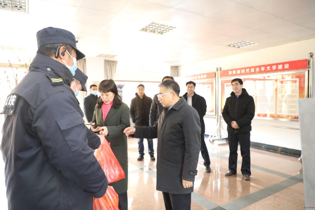 胡金焱一行先后走訪了辦公樓門衛值班室、綜合應急指揮中心、西大門門衛崗亭、會議中心物業、換熱站等一線崗位,親切看望和慰問了一線教職員工,并致以節日問候和新春祝福,對他們的辛勤工作表示感謝。胡金焱詳細詢問了寒假安保、后勤工作有關情況,要求各項工作要做到精細管理、溫馨服務,不斷提升人防物防技防工作水平。胡金焱勉勵一線教職員工要繼續堅持優良作風、發揚奉獻精神,為師生歡度春節提供堅實保障。