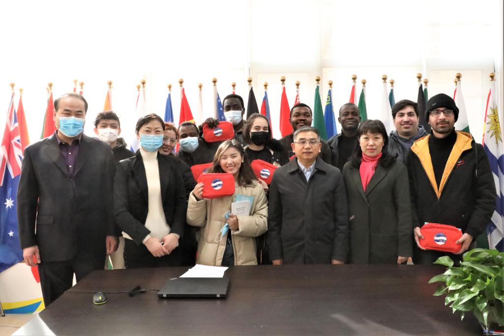 隨后,胡金焱一行前往國際教育學院看望慰問了在校留學生,為留學生們送去了新春祝福和問候,并現場發放了防疫健康包和疫情防控手冊。胡金焱詳細詢問了留學生的生活和學習情況,他鼓勵留學生切身感受和體驗中國傳統文化,度過一個平安祥和的中國年。胡金焱還與遠在海外的留學生以及中國研究生海外志愿者視頻連線,向在異國的青大學子們致以新春祝福和誠摯慰問,線上師生代表向胡書記介紹了自己的學習和生活情況,座談現場氣氛十分融洽。胡金焱書記一行還走訪慰問了春節期間堅守工作崗位的國際教育學院值班人員。