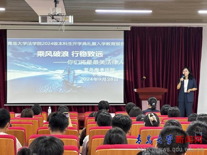 新聞網(wǎng)訊 9月28日上午,法學(xué)院2024級(jí)本科生開(kāi)學(xué)典禮暨入學(xué)教育報(bào)告會(huì)在金家?guī)X校區(qū)圖文中心3樓報(bào)告廳舉行。全體院領(lǐng)導(dǎo),校友代表、青島海事法院法官王愛(ài)玲,教師代表以及2024級(jí)本科生參加典禮。